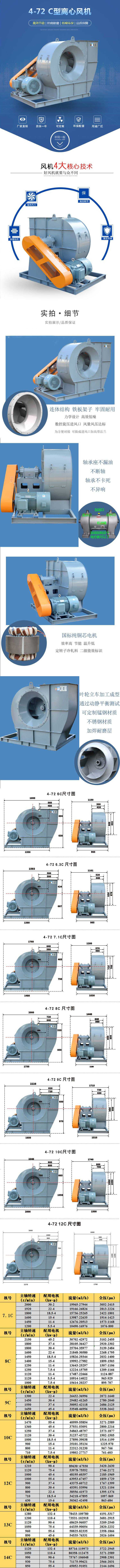 4、4-72離心風機電機直聯傳動規格有:NO2.8A、3.2A、3.6A、4A、4.5A、6A聯軸器傳動規格有:NO6D、8D、10D、12D;皮帶輪傳動有:NO6C、8C、10C、12C及NO16B、20B共16種規格。