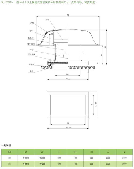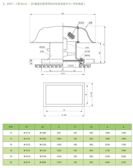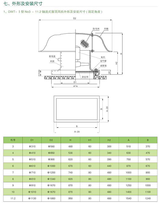 ⑥適用于工廠、倉庫、大廈天臺、別墅、天井、花房、禽畜養殖、礦山坑道及一切房頂的通氣、換氣、散氣場所。